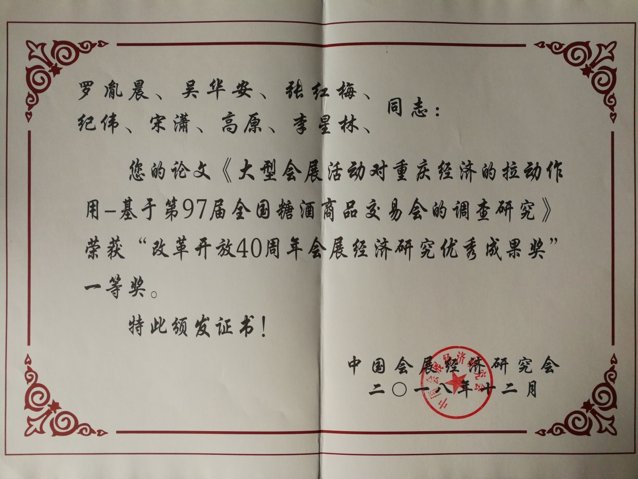 本月在由中国会展经济研究会组织的“改革开放40周年会展经济研究优秀成果奖”评选中,由长江会展研究院研究员罗胤晨博士等完成的论文《大型会展活动对重庆经济的拉动作用—基于第97届全国糖酒商品交易会的调查研究》荣获一等奖。同时,由研究员宋潇等老师完成的《城市会展业发展的影响因素构建—基于重庆市的案例研究》一文,被中国会展经济研究会2018年年会论文集收录。