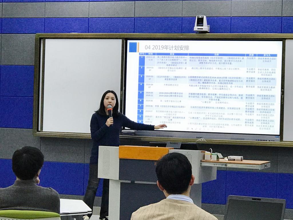 活动由杨麒渊老师主持,共五项议程,分别是团队建设年终总结、点滴时刻分享、嘉奖表彰、李政军教授评述、李红平院长寄语。首先,经济学教学团队队长潘曦老师代表团队进行了年终总结发言,主要从团队目标与精神、建设举措与成果、个体成长、2019年计划安排四方面对团队一年建设情况做梳理,重申了团队目标“融智育人”与团队精神“专业、规范、特色、卓越”的重要性,并以时间轴方式回顾了十项大事记,整理了五项初步成果,最后提出2019年工作计划安排。