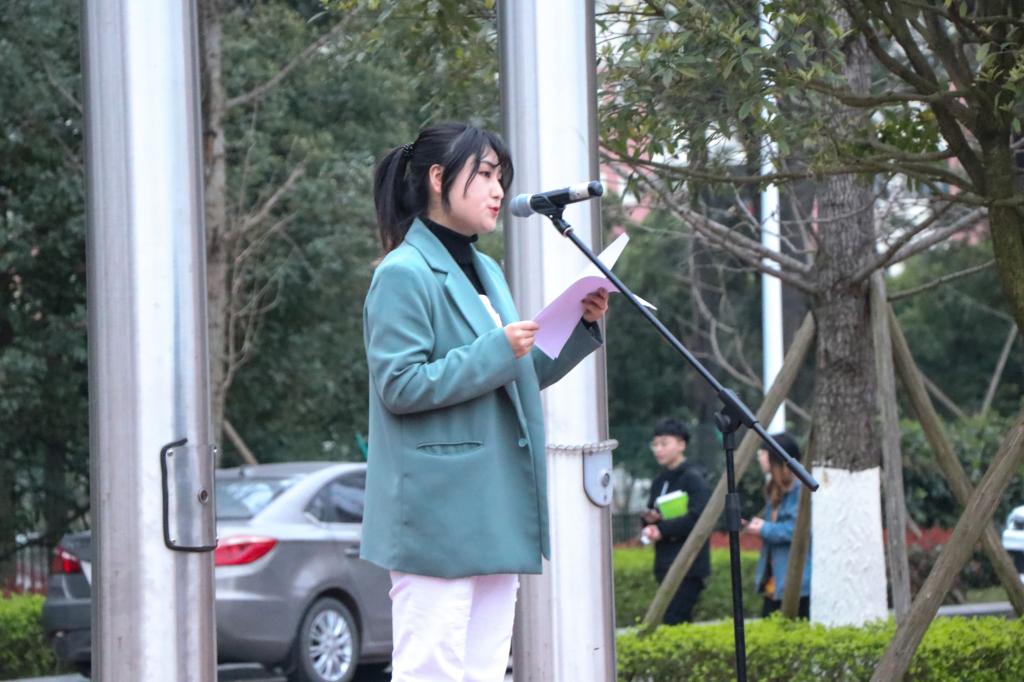 礼毕后,来自商务学院2018级网新2班的谭权洁做了题为“国旗下的誓言”的发言。她以中国工程院院士林俊德为引,赞扬了爱国之情的崇高与伟大。也国士为榜样,号召同学们踏实学习,刻苦钻研,奋力拼搏,开拓创新。