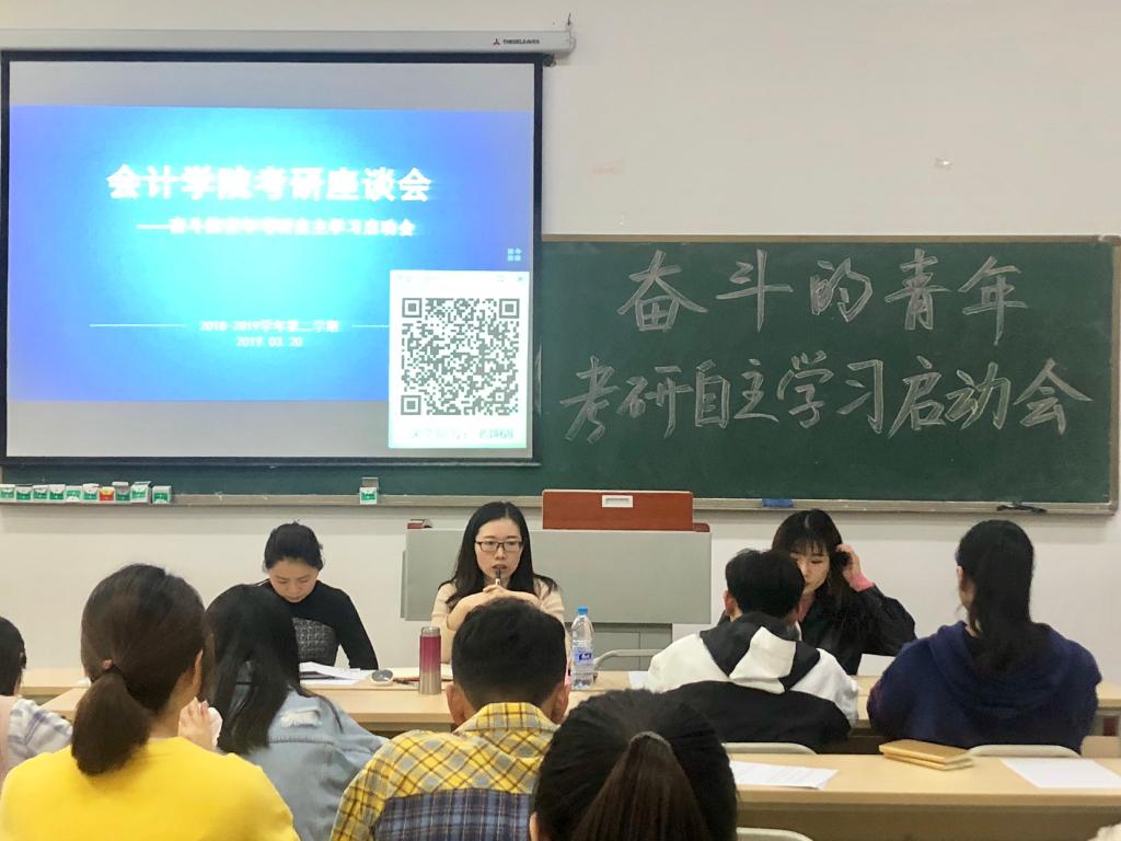 为营造学院浓厚而积极的考研氛围,加强对低年级志向考研学生的支持,2019年3月20日,会计学院在教学楼1402教室举行了考研座谈会暨“奋斗的青年”考研自主学习启动会。会计学院党总支副书记姚转花、专职辅导员唐凤芬老师、2016级学生代表黄秋月同学、2017级和2018级有考研意向的学生代表参加了本次座谈会。