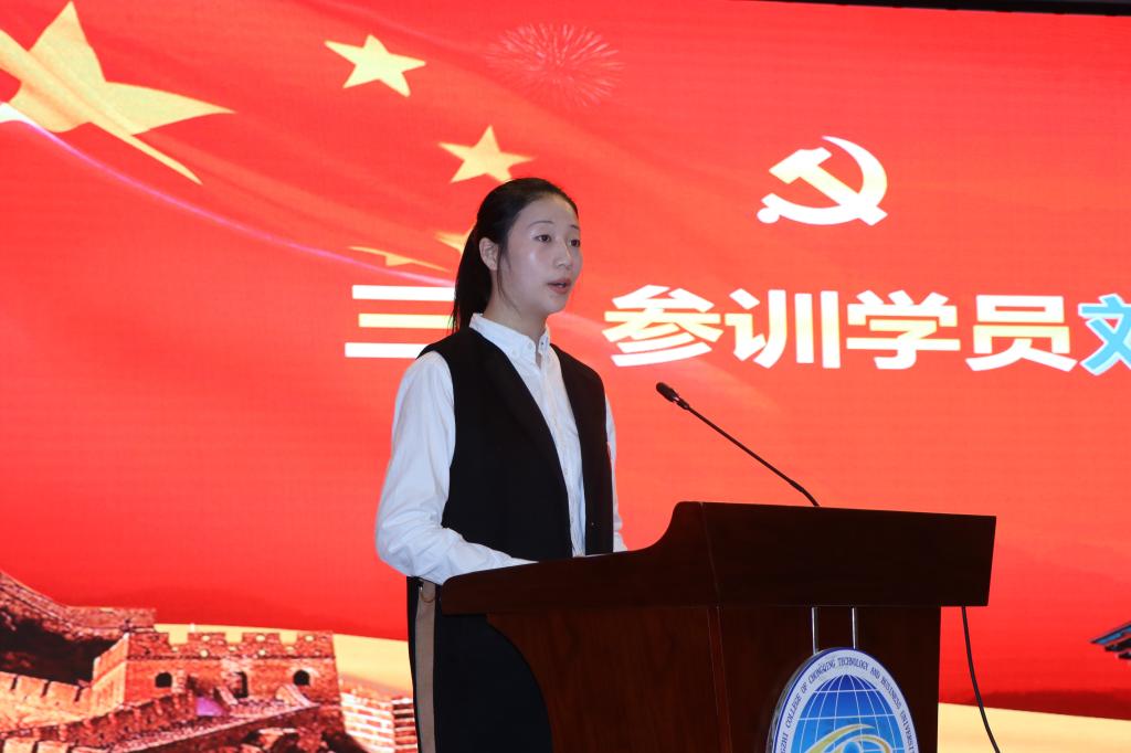 随后参训学员代表刘明玮发言,她希望参训学员珍惜此次培训机会,多互动多交流,并表示要不断加强对党的基本知识,基本理论的学习,在培训期间遵守纪律,尊重老师,认真学习,争当先锋模范,积极向党组织靠拢,争取早日加入中国共产党。