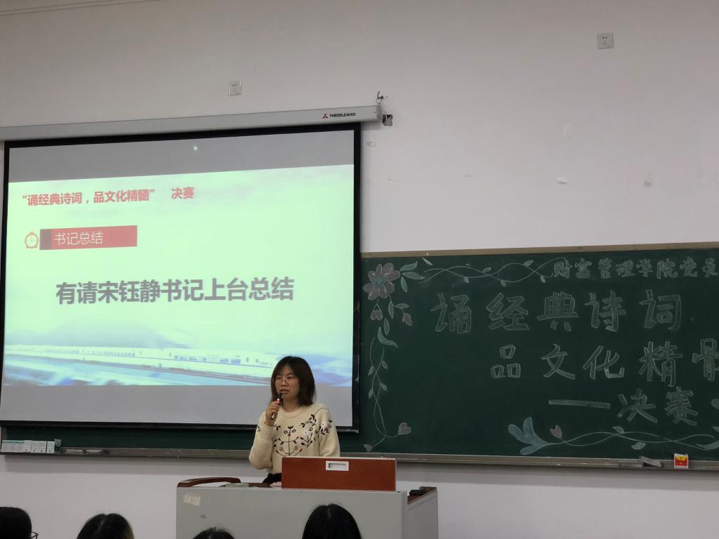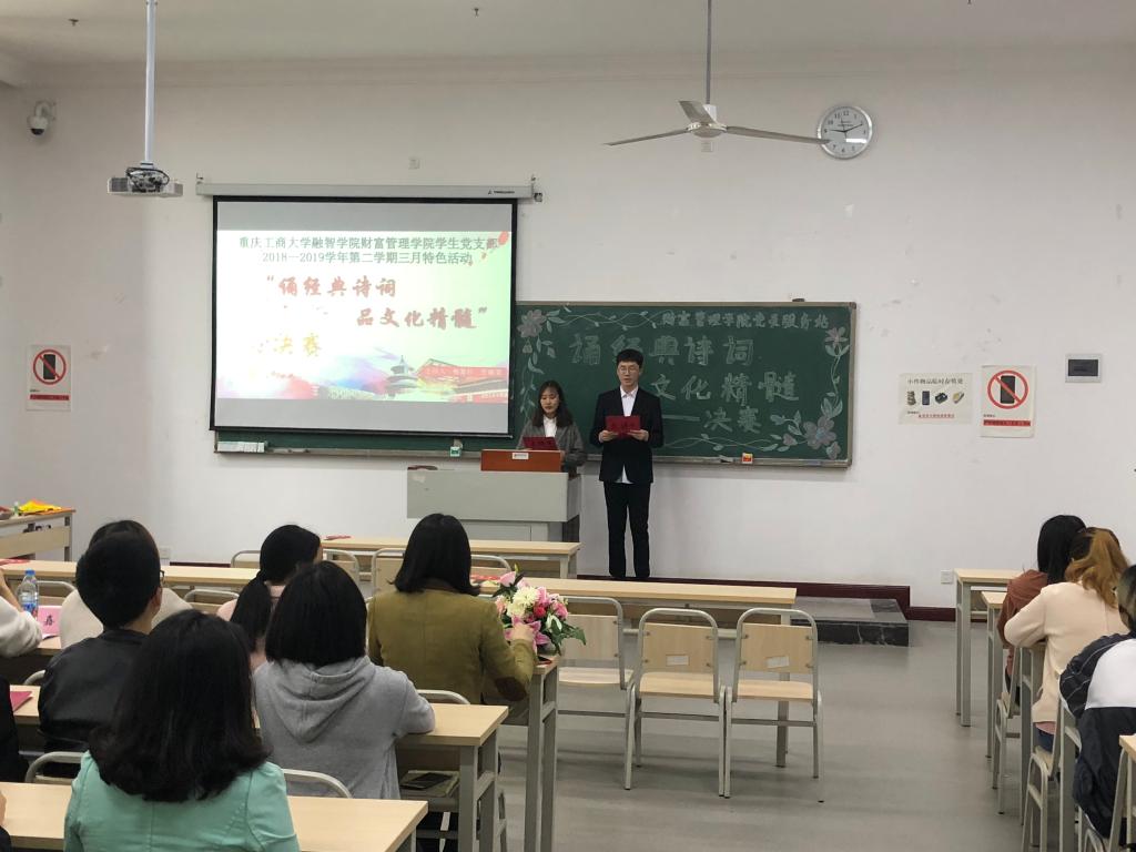 为营造良好的校园文化氛围,丰富传统文化的内涵和扩展传统文化的影响力。财富管理学院学生党支部分别于2019年3月26日中午12点10在教学楼1207教室开展了以“诵经典诗词,品文化精髓”为主题的诗词朗诵比赛初赛和4月3日中午在教学楼1513教室进行了决赛。