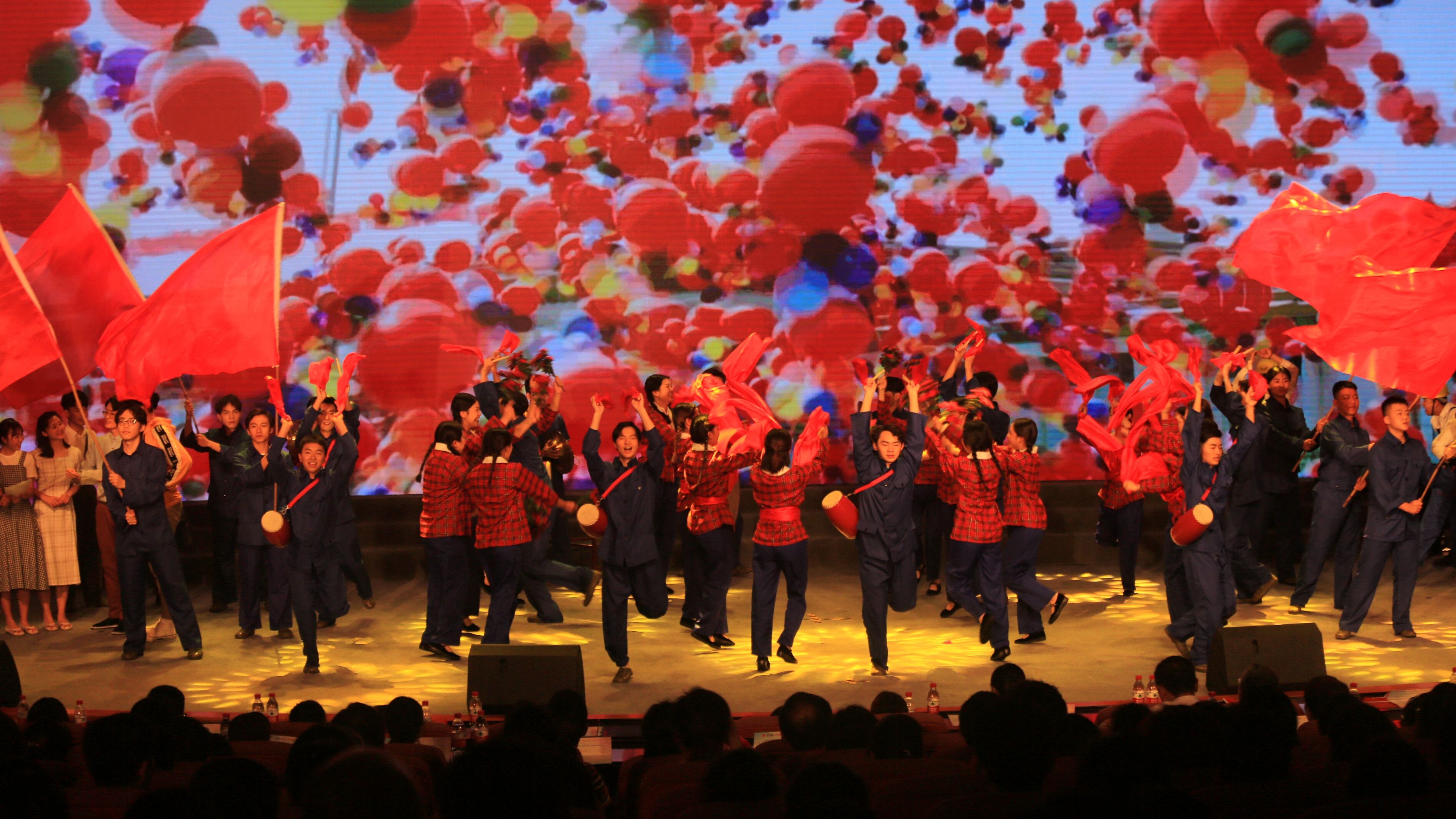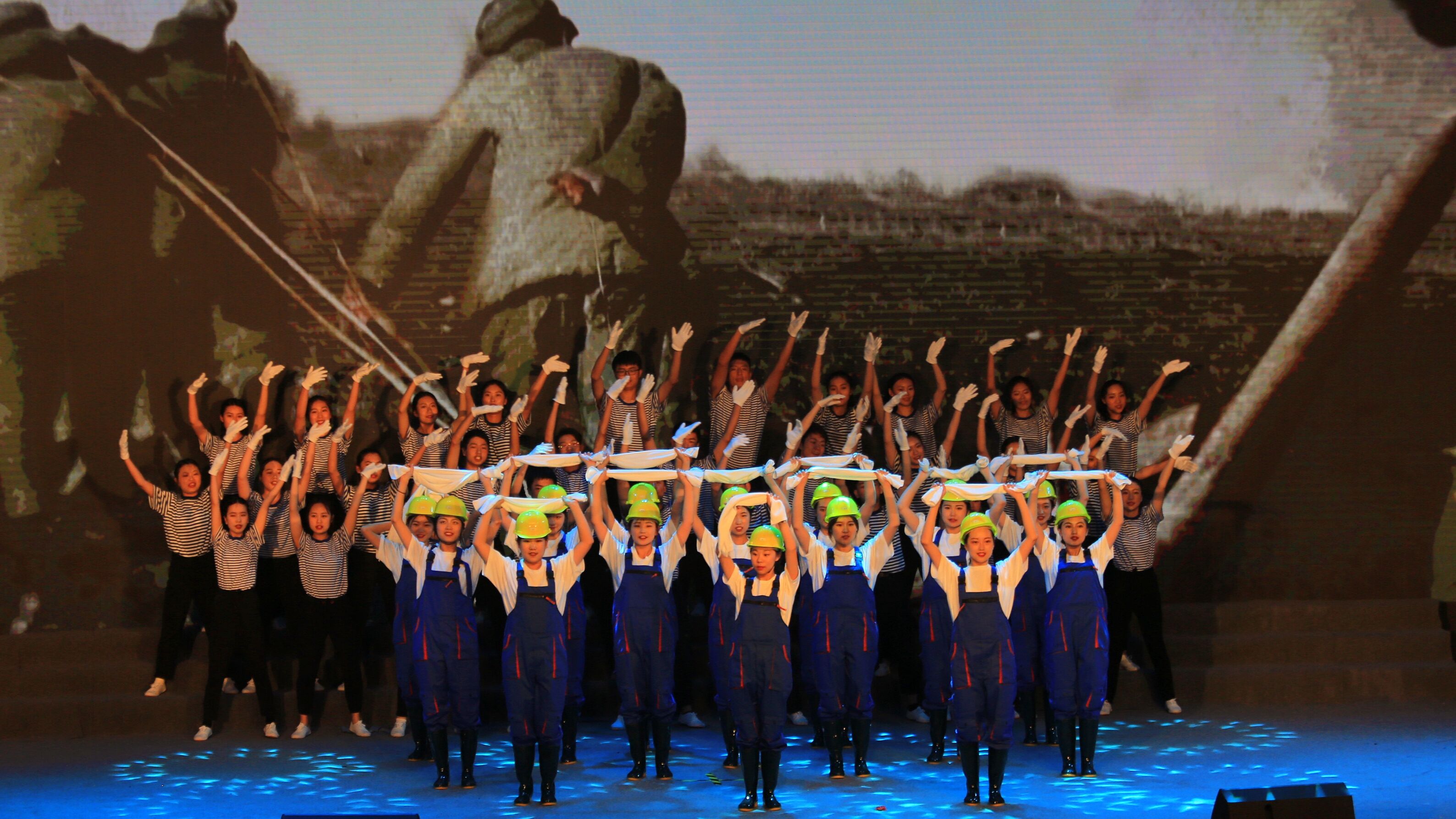 我校主要承担第二篇章的演出内容,第二篇章以“追梦——建设新中国“为题,用情景歌舞的方式展示了1949年中华人民共和国成立后,工人、农民、解放军等各行各业青年热火朝天为建设新中国而奋斗的场景。在我校师生的共同努力下,经过剧本研讨、排练修改、后期彩排等多个环节的反复磨合,每天排练3个场次,历时近30天,最终呈现于舞台。