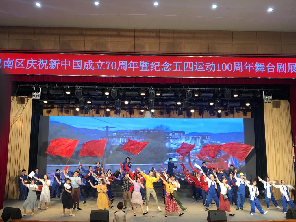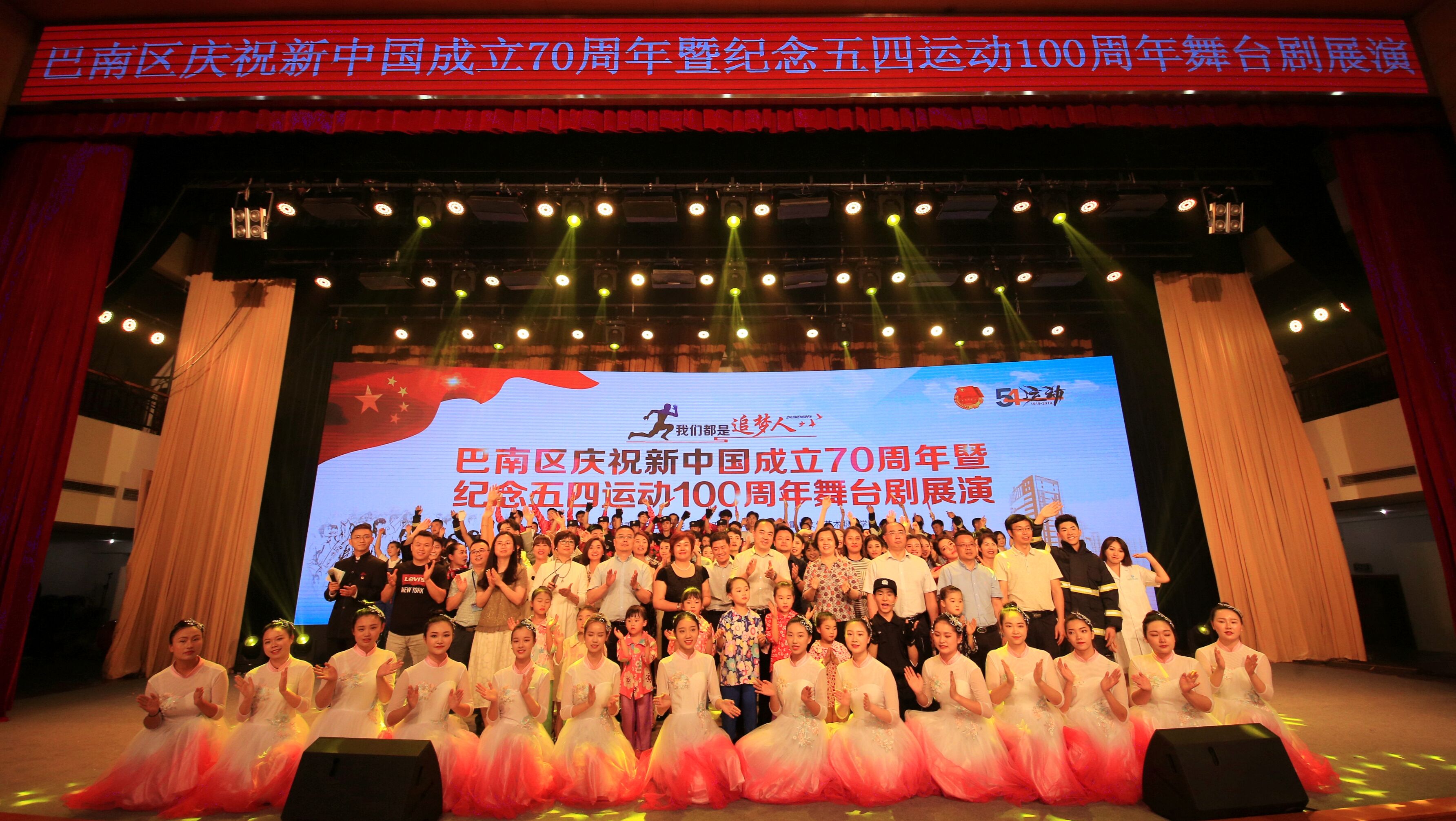 为庆祝新中国成立70周年,纪念五四运动100周年,2019年4月28日下午2点半,由团巴南区委、重庆工商大学融智学院、重庆文化艺术职业学院共同主办的《我们都是追梦人》舞台剧展演活动在巴南区政府大礼堂顺利举行。出席本次活动的嘉宾有团市委党组成员、副书记叶力娜,巴南区委常委、宣传部部长周密,团巴南区委书记腊丁扬,团巴南区委副书记张贵彬、张琦,我校党委书记丁广龙、党委副书记陈龙国以及校长助理房朝君。我校作为此次《我们都是追梦人》舞台剧的主创单位,共有130余人参加演出,受到了区委领导的一致好评。