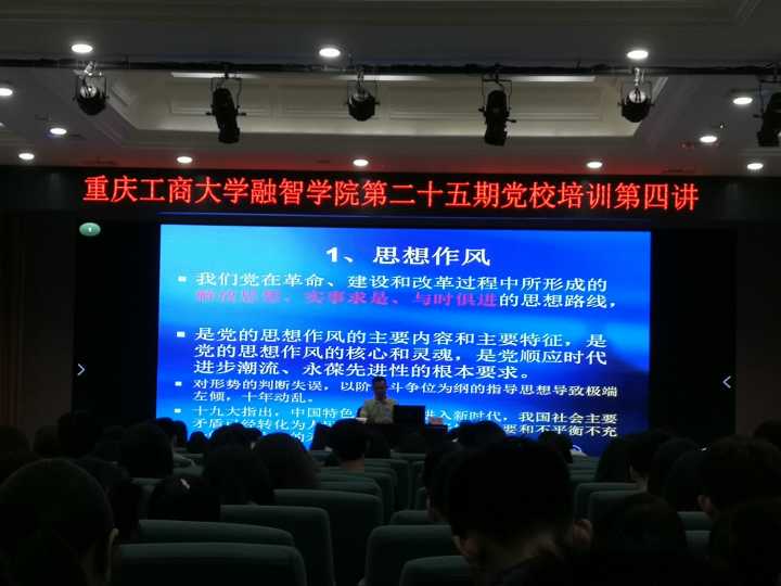 419日中午12:30,重庆工商大学融智学院第25期党的知识培训班第四讲在学术报告厅进行。本次培训由重庆房地产职业学院李果副院长担任主讲人。