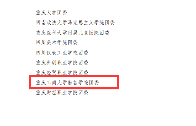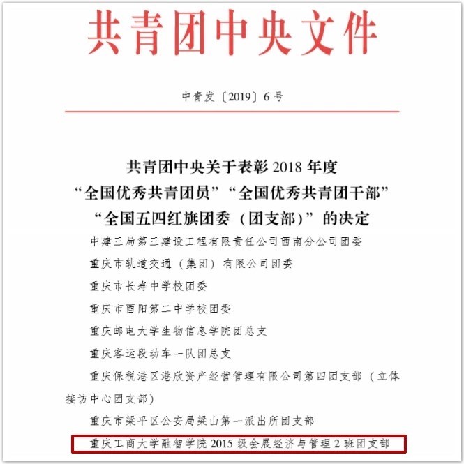 4月26日,共青团中央发布表彰决定,授予我校商务学院2015级会展经济与管理2班团支部“全国五四红旗团支部”称号,这是我校首次获得共青团中央授予基层团支部的最高荣誉。4月30日,重庆市人力资源和社会保障局、共青团重庆市委联合发布表彰决定,授予我校团委“重庆市五四红旗团委”称号,该奖项是重庆市级共青团荣誉的最高殊荣,本次共评选了25个“重庆市五四红旗团委”,其中高校共有8所,我校是唯一获得该殊荣的民办本科高校。