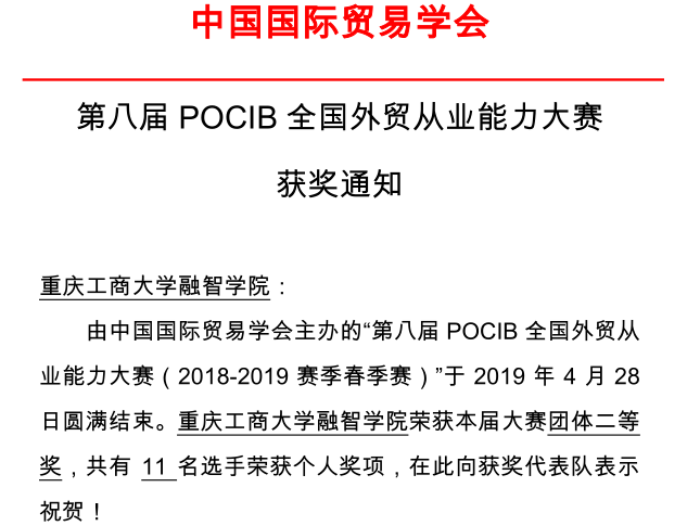 由中国国际贸易学会主办的“第八届POCIB全国外贸从业能力大赛(春季赛)”于2019年4月28日上午10时拉下帷幕,我校商务学院选派20名国际经济与贸易专业学生组成团队参加了此次大赛,最终获得全国第四赛站团体二等奖的佳绩,同时,参赛选手刘缘圆获得赛站国家排名个人二等奖,刘燕、王娟、刘星等10名同学获得赛站国家排名个人三等奖,这是我校国贸学子参加全国性专业竞赛以来获得的又一次奖项突破。