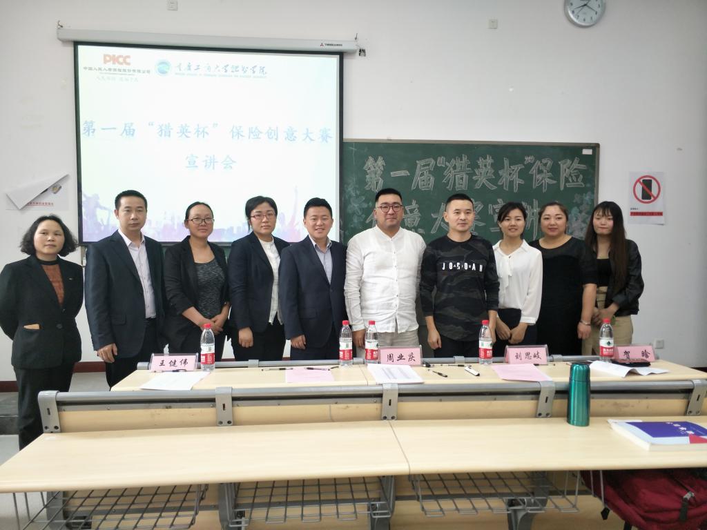 2019年5月8日中午12时30分,重庆工商大学融智学院第一届“猎英杯”保险创意大赛宣讲会于教学楼1420教室顺利举行。本次比赛由中国人民人寿保险股份有限公司重庆分公司和重庆工商大学融智学院金融学院联合主办,前期通过班级QQ群、金融学院微信公众号、班级微信群等渠道对本次比赛进行了宣传,最终共有28组来自不同专业的115名同学们报名参加了本次比赛。其中17组来自2016级保险学专业,11组来自其它专业。出席本次宣讲会的中国人民人寿保险股份有限公司重庆分公司嘉宾有:巴南綦江银保机构负责人周业庆先生、团体保险部主任刘思岐先生、团险事业部销售总监王健伟先生、团险事业部营业部经理张丽女士、团险事业部营业部经理张桂兰女士、团险事业部高级客户经理余静女士、巴南綦江银保营业部经理穆春霞女士、巴南綦江银保初级组经理邹组华女士、巴南綦江银保组训周密女士;重庆工商大学融智学院金融学院嘉宾有:副院长贺晗副教授、院长助理李静老师、学团办主任于成江老师。