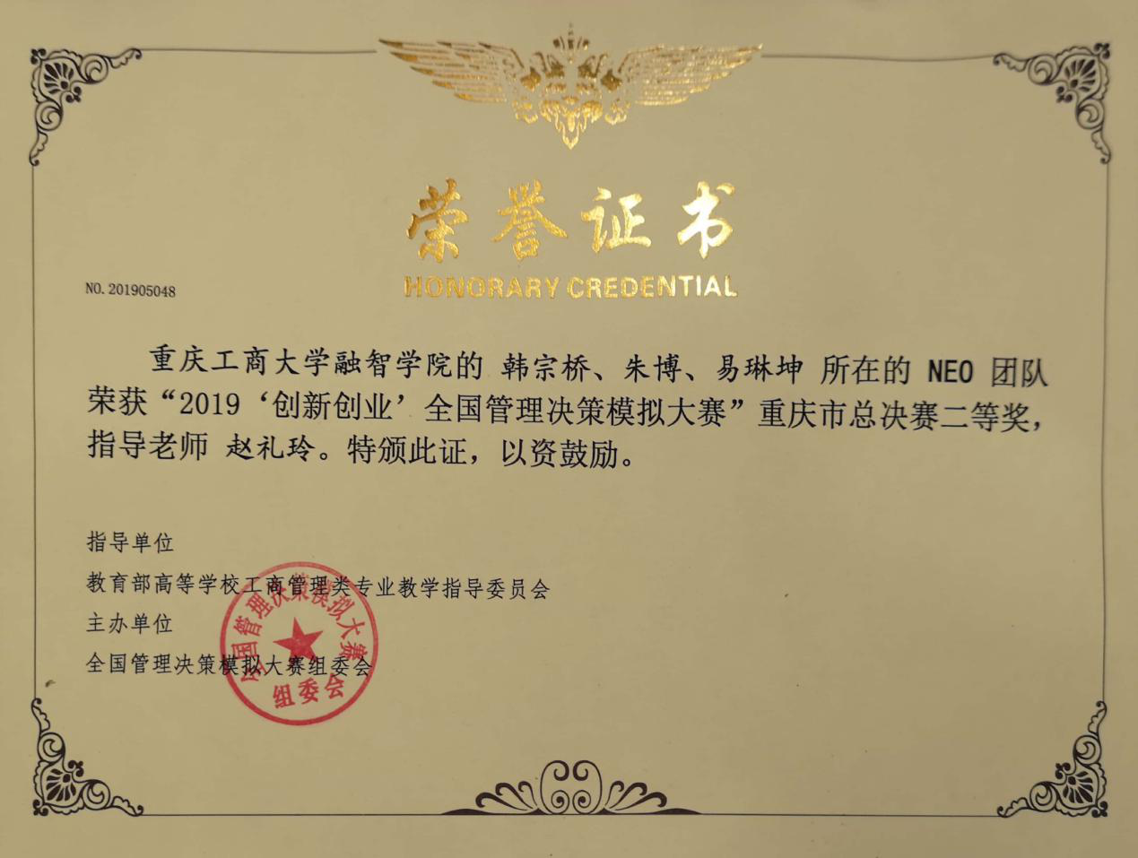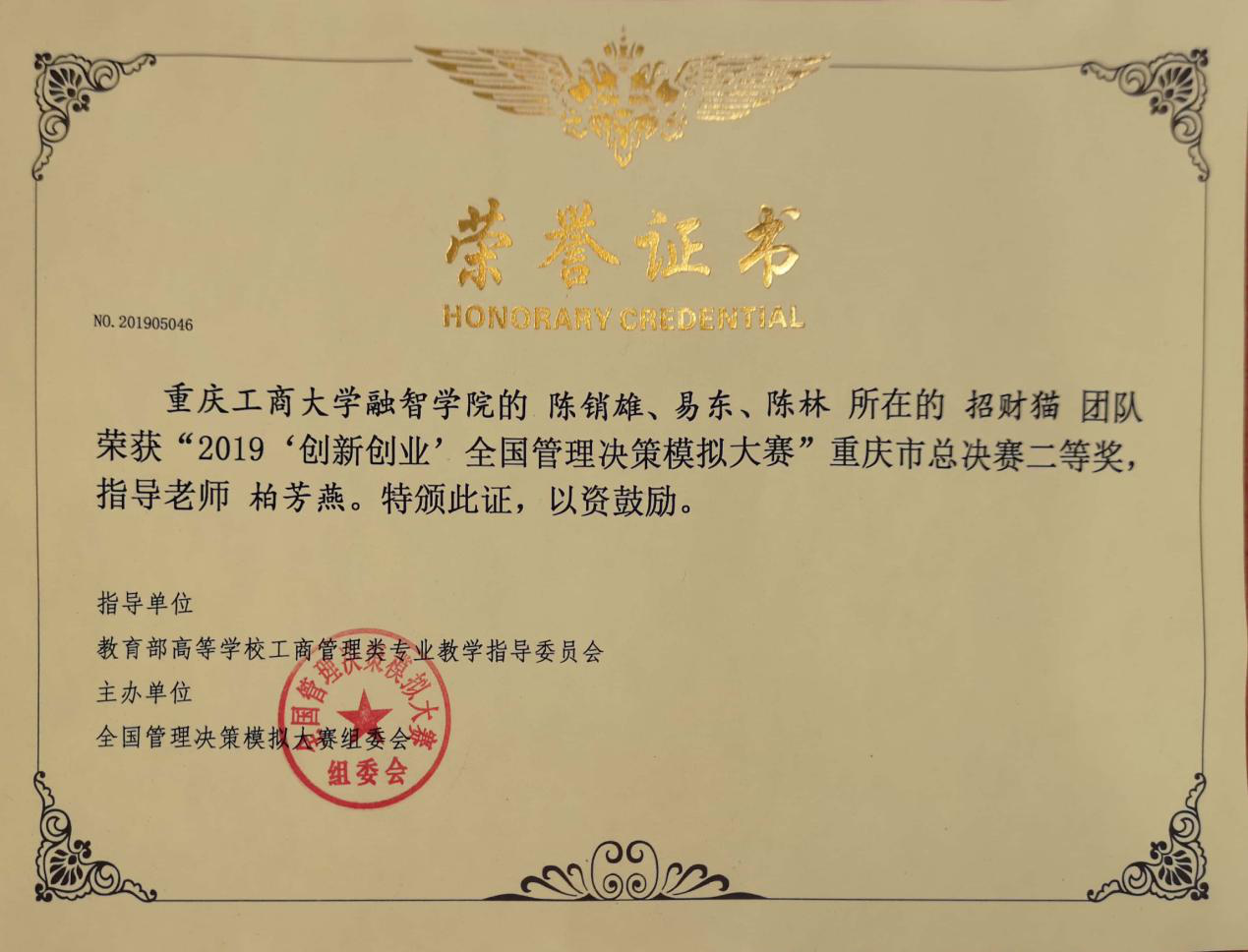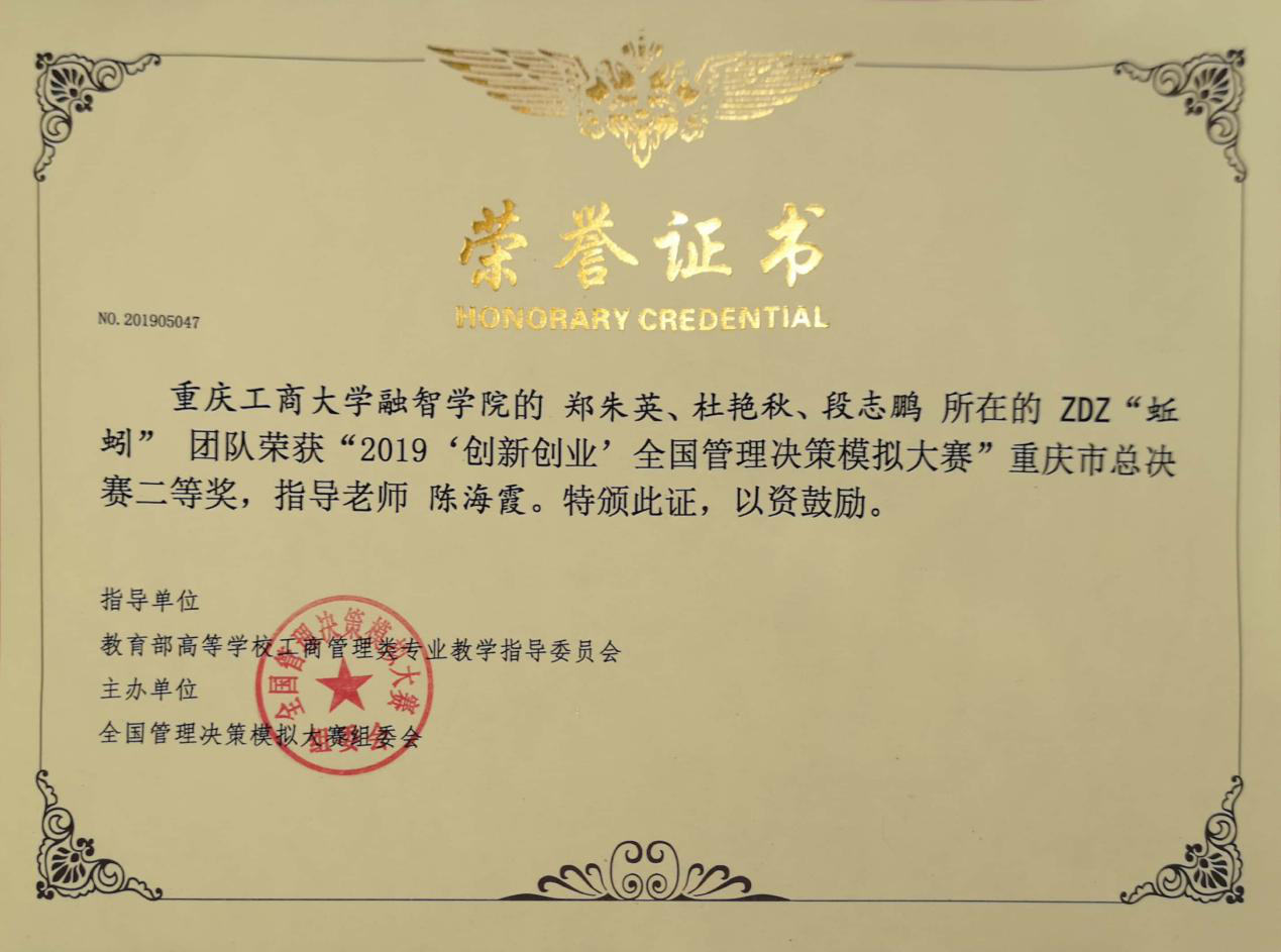 (通讯员:郑朱英)由全国管理决策模拟大赛组委会主办的2019“创新创业”全国管理决策模拟大赛重庆市级赛于4月27日早上8点50分拉开帷幕。本次比赛我校选派3支队伍,分别是管理工程学院郑朱英、杜艳秋、段志鹏组成的ZDZ“蚯蚓”队和易东、陈销雄、陈林组成的“招财猫”队,物流工程学院韩宗桥、朱博、易琳坤组成的“NEO”队,3个参赛团队分别在陈海霞、柏芳燕和赵礼玲老师的指导下,经过长达8小时紧张的决策模拟比拼,3支队伍均获得重庆市总决赛二等奖。