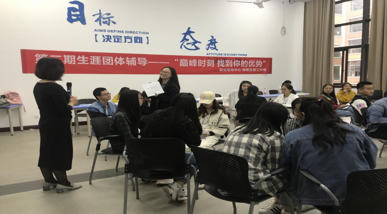 为引导学生找到自己的能力优势,认清职业发展的目标,把握当下努力的方向,2019年5月30日,由就业指导中心、德馨生涯工作室协同举办的“巅峰时刻 找到你的优势”第二期生涯团体辅导在1208教室顺利开展。本次团辅由西南大学靠谱的电子游戏官网处就业中心主任、GCDF全球职业规划师、BCC生涯教练的田振敏老师主讲。德馨生涯工作室全体成员参与了观摩学习。