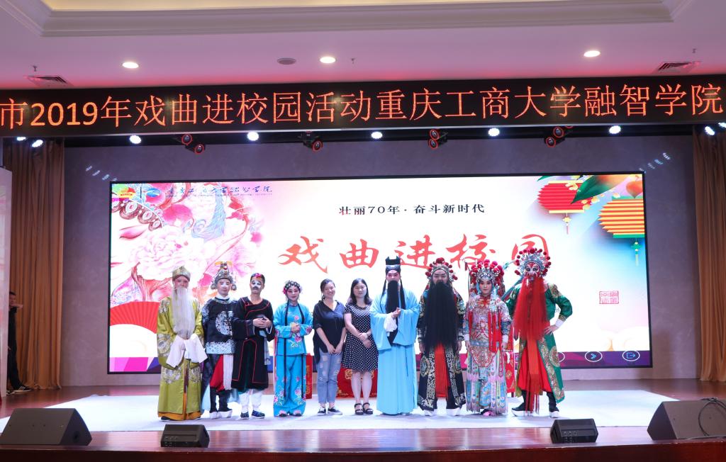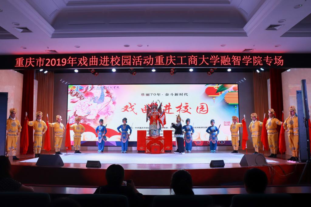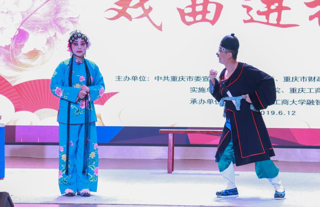 (通讯员 徐与涵)生旦净末演百态,字正腔圆唱古今。为传承弘扬传统文化精髓,培养学生戏曲素养,营造校园戏曲文化氛围,推进戏曲艺术振兴发展。由中共重庆市委宣传部、重庆市教委、重庆市财政局、重庆市文化和旅游发展委员会主办,重庆市川剧院、重庆工商大学融智学院实施,共青团重庆工商大学融智学院委员会承办的“壮丽70年·奋斗新时代——戏曲进校园”活动于2019年6月12日18:30在我校学术报告厅举办。整场演出包括三段经典川剧:《桂英打雁》(弹戏)、《裁缝偷布》(灯戏)、《杀伯奢》(胡琴)。近800名师生观看了演出。