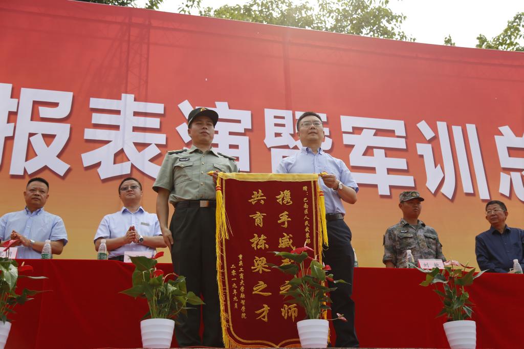 最后,党委书记丁广龙代表全体师生向巴南区人民武装部赠送了锦旗。至此,重庆工商大学融智学院2019级学生汇报表演暨军训总结表彰大会圆满结束。