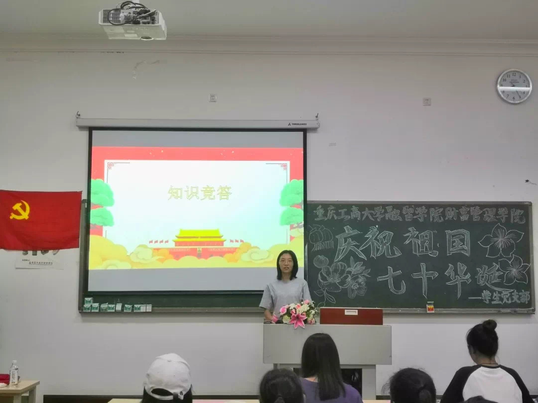 为弘扬中华民族传统文化,增强同学们爱国主义情怀,在祖国七十华诞来临之际,财富管理学院党员服务站于92918:301412教室开展了庆祖国七十华诞的主题活动。出席本次活动的有财富管理学院党总支副书记宋钰静、学生党支部书记左小容、学生党支部组织委员芦丹、学生党支部纪检委员薛超、教师党支部组织委员李秋河、学生党支部全体党员同志以及党员服务站全体工作人员。