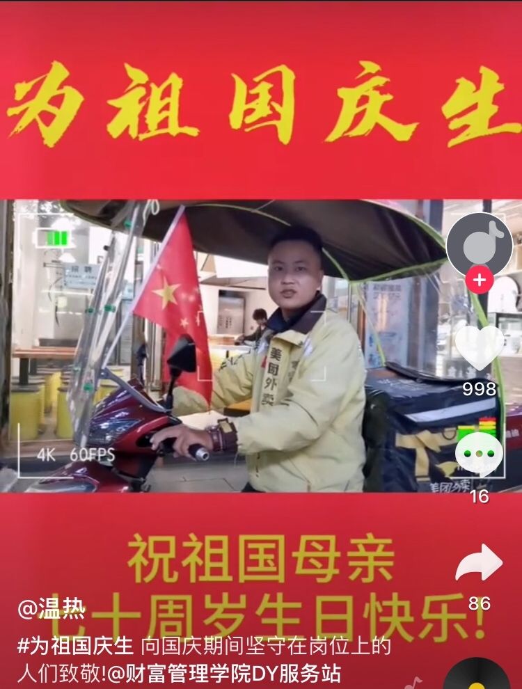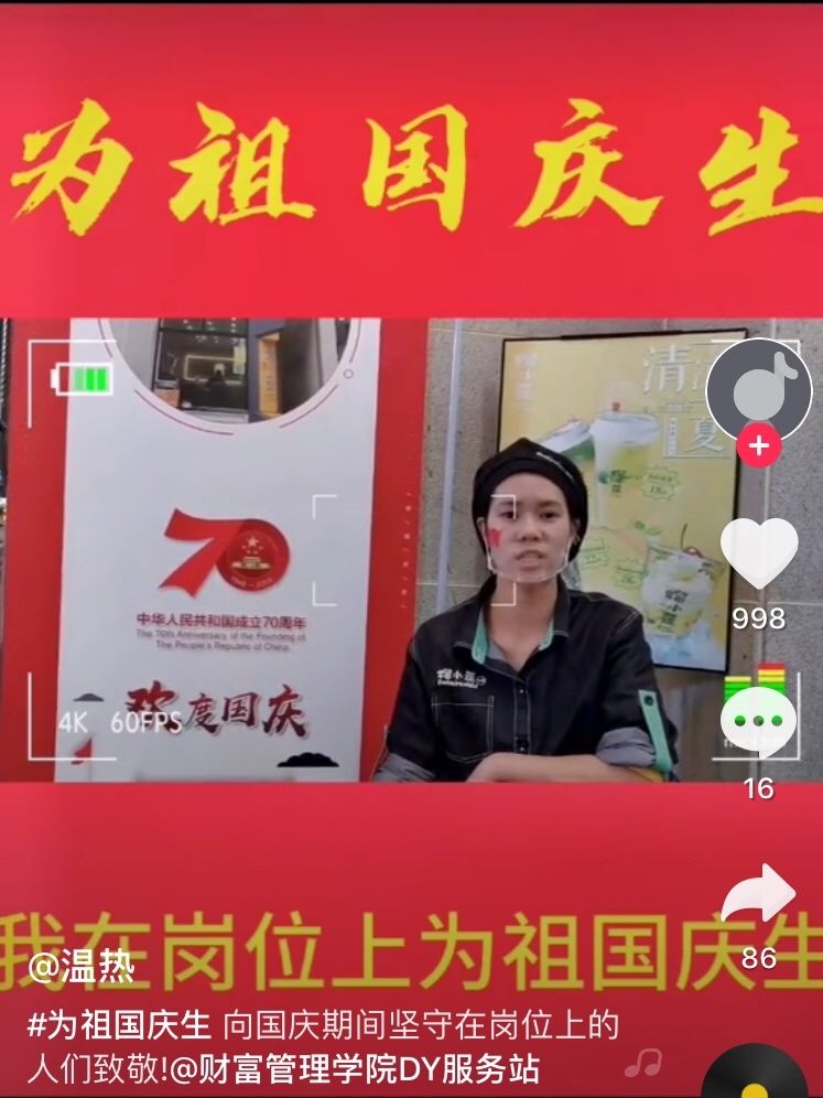 在抖音视频拍摄环节中,各小组通过拍摄抖音视频的方式表达了对祖国的美好祝福,展现了大家积极向上的精神风貌。第十一小组的视频剪辑记录了国庆期间不同岗位劳动者的面孔,有的不辞辛劳,坚守在自己的岗位上;有的默默无闻,为祖国的建设贡献力量;有的以饱满的热情、昂扬的斗志对祖国深情告白。中国人民把自己的国家建设得日益强大,他们因中国的蓬勃发展感到无比的骄傲和自豪。第十四小组拍摄的视频记录了重庆为祖国庆生的夜景,欢快的音乐节奏与夜景相辅相成,旋律与色彩间透出对祖国的祝福。少年兴则国兴,少年强则国强。简短的视频蕴含了深刻的意义,展现出祖国的繁荣与富强,同学们真正把爱国之志变成报国之行。