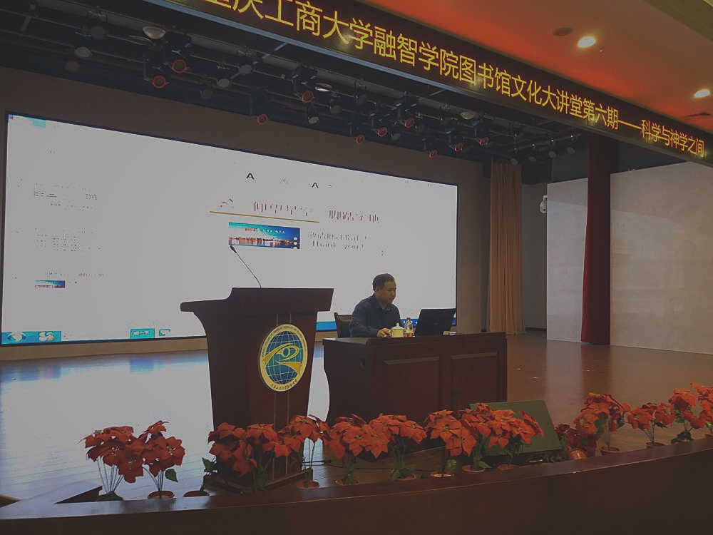 2019年10月23日下午,重庆市社科联党组书记、专职副主席杨清明教授应邀出席我校图书馆第六期文化大讲堂,为我校师生做了“科学和神学之间”的哲学讲座。校党委书记丁广龙主持讲座,近300名师生到场聆听。