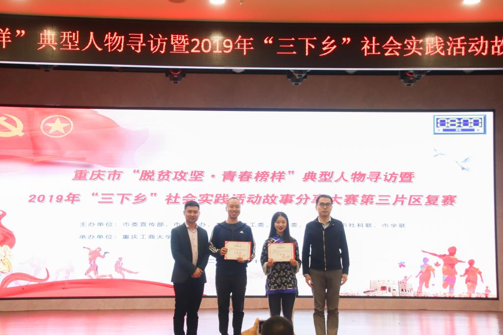 比赛中,参赛团队围绕“三下乡”社会实践活动参与脱贫攻坚战的生动实践以及寻访发现的青春榜样人物参与脱贫攻坚的感人事迹,通过演讲、情景剧、小品、快板等形式进行展演。经过激烈角逐,我校推送的《不一样的年代,一样的青春》、重庆第二师范学院推送的《你见过那朵理论之花吗-记重庆第二师范学院暑假三下乡习近平总书记扶贫工作重要论述理论宣讲团》以及重庆文化艺术职业学院推送的《山那边》等三件作品取得前三名的好成绩,并入围市级决赛。