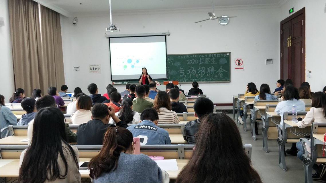 为切实做好我院2020届毕业生就业工作,多渠道开发就业岗位,为毕业生搭建精准、方便、快捷的就业服务平台。重庆工商大学融智学院财富管理学院于2019年10月24日在教学楼1403教室举办了专场招聘会。一方集团代表、德慧(重庆)清洁服务有限公司代表、汇丰智力产业组织集团代表、财富管理学院党总支副书记宋钰静、学团办副主任徐丽锦、毕业班辅导员芦丹以及学院2020届毕业生出席了本次招聘会。