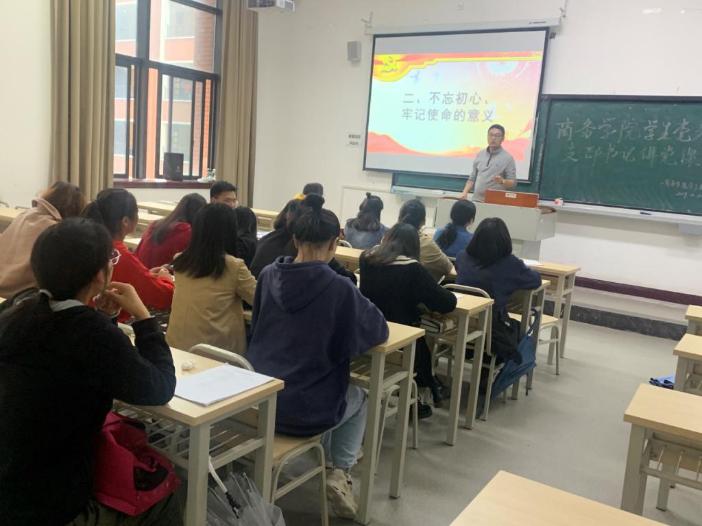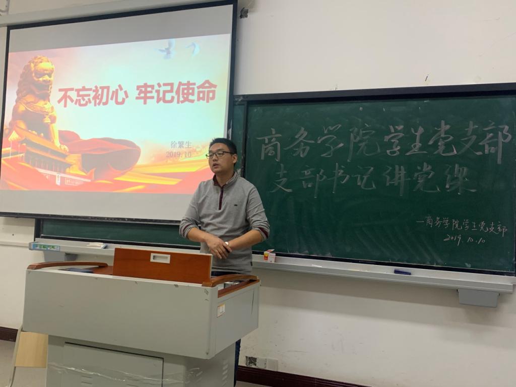 2019年10月10日商务学院党总支学生支部“不忘初心、牢记使命”主题教育党课在1302教室顺利开展,本次党课由商务学院党总支学生支部书记徐繁生老师主讲。商务学院全体学生党员、发展对象、入党积极分子代表参加本次党课培训。