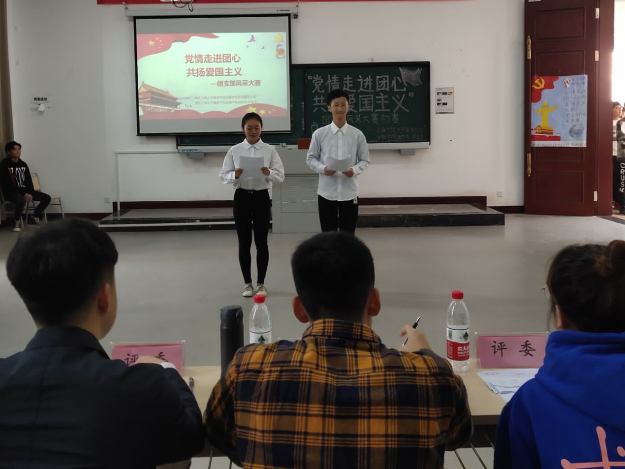 比赛伊始,由两位主持人介绍比赛流程:比赛分为三个场次,按照抽签顺序进行比赛,每三个团支部比赛结束后宣布一次评分成绩。团支部风采评比标准分为精神面貌、艺术表现以及服装伴奏三部分。