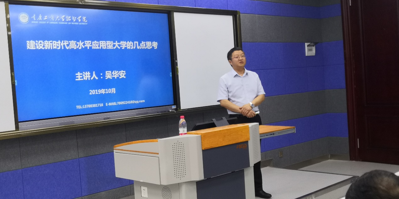 常务副校长吴华安的报告以“建设新时代高水平应用型大学的几点思考”为题,从世界格局和历史发展两个维度阐释了新时代高等教育和高等教育新时代的深刻内涵,点明了第四次工业革命的新时代背景带来的新机遇、新挑战,他还向大家介绍了融智学院的发展历程和重要节点,并结合自身的教学成长经历,勉励大家“不忘初心、牢记使命”,对未来充满信心,做好职业规划,与融智一起培养中国特色社会主义建设者和接班人。