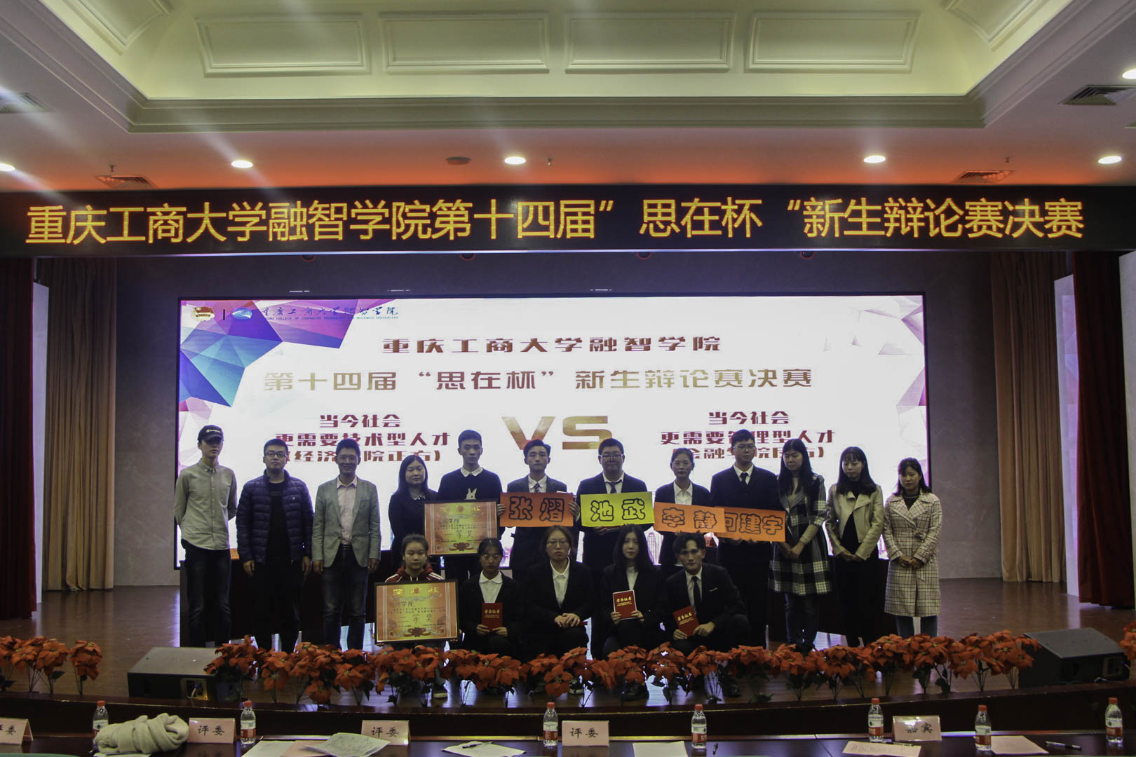 颁奖典礼在场下观众的欢呼声里举行,嘉宾和评委们分别为第十四届“思在杯”新生辩论赛最佳辩手、最佳辩题、季军代表队、亚军代表队、冠军代表队和最佳组织颁奖,台上领奖代表们自信的笑容展现了青春的风采与骄傲。