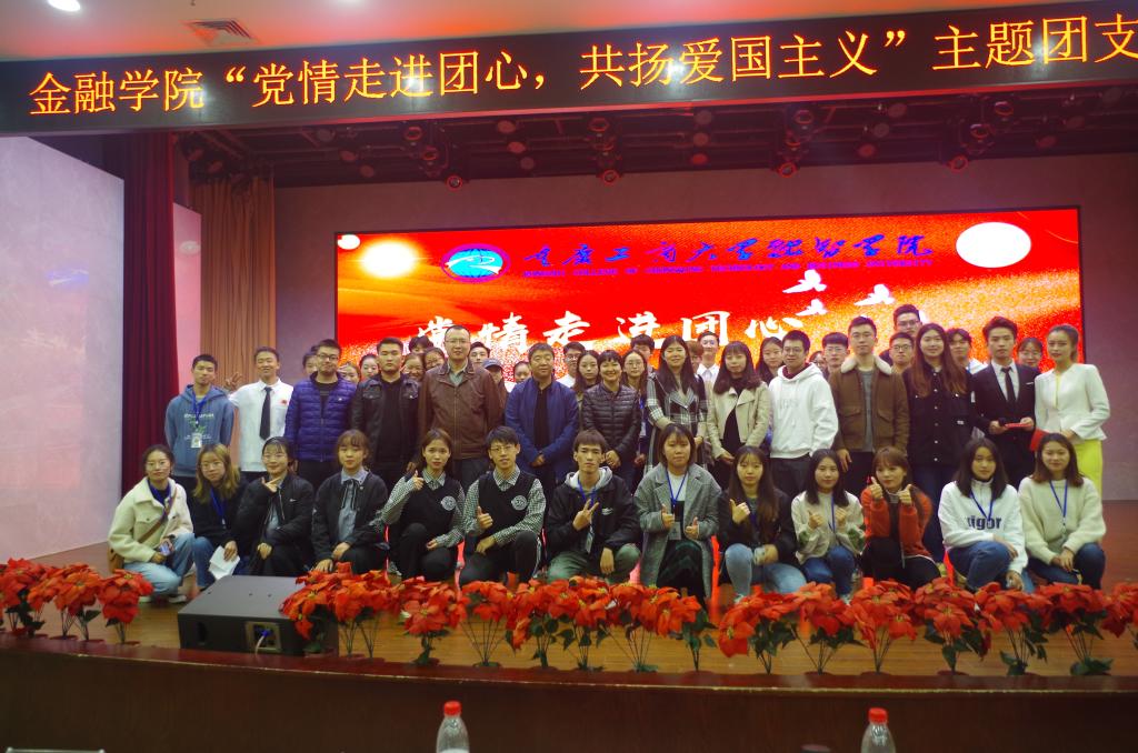 为庆祝建国七十周年,弘扬爱国精神,增加同学们对“党”的理解,使党和团更好的融合。重庆工商大学融智学院金融学院于2019年11月6日12:00,在学术报告厅举办“党情走进团心,共扬爱国主义”主题团支部风采大赛决赛。校团委书记兼学生处副处长李刚老师、金融学院党总支副书记陈萍老师、团总支书记于成江老师、学生党支部书记刘官青老师、辅导员闾鹏老师、张凤瑛老师、易思老师、晏鸿萃老师、郑旺老师、游韵老师作为嘉宾出席此次决赛;管理工程学院党总支副书记高雪莲老师、经济学院综合办副主任兼校团委副书记夏文瑞老师、信息工程学院综合办副主任梁建良老师、校党员服务站站长秦杰、校学生会主席周艺担任评委。