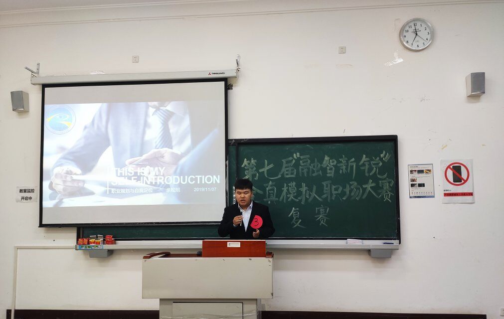 比赛的第一个环节“大显身手”。选手们认真准备此次比赛,穿着干练正装,精神抖擞,全身散发着职场精英的魄力,在台上落落大方,围绕着个人履历、自我分析、专业能力、荣获奖项、岗位认知以及未来规划方面精心制作了PPT进行演讲。五分钟的演讲,讲出了他们的奋斗方向,讲出了他们的计划理想,讲出了他们对未来的期望并为此想要做出的努力:在职场上发挥优势,不断逐梦。1302教室六号李睿岚,以信念和潜力为出发点,逻辑缜密清晰的表达对工作的规划,模拟出现在以及未来的计划,在众人中脱颖而出。1304教室一号王丹,从自身专业素质出发,以目标为点,以工作规划理念为线,以小见大,娓娓讲述自己的计划和肩上担有的责任去模拟竞争岗位。1308教室的四号选手叶静涛尤其出彩,专业且自信,轻松又自如的把控全场,没有丝毫的露怯,评委对他也是赞不绝口,显然大家都期待他后面的精彩表现,不得不说给后面上场的选手造成了不小的压力。演讲完毕,每一位选手都用自己的独到见解回答了评委老师提出的专业性问题。评委老师对选手的表现加以表扬的同时也指出了其中的不足之处,并对此加以分析后向选手传授经验。选手们把未来规划得井井有条,相信他们对自己的未来有更好的理解和规划。