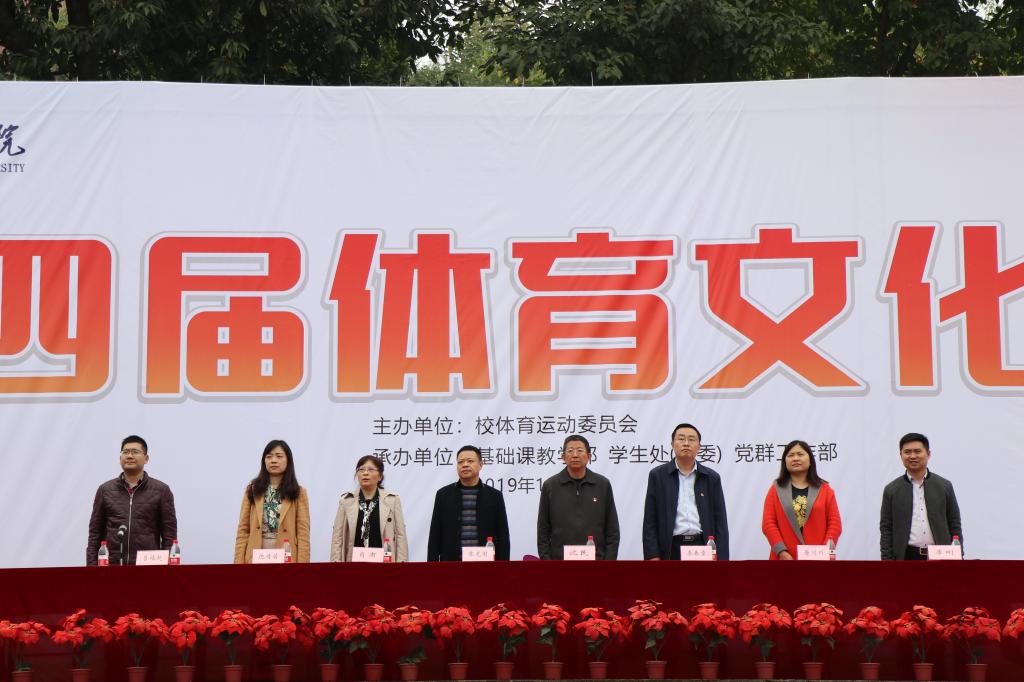 子月寒凉,和着秋风,以英姿作勋,以丹桂作章11月8日上午,我校第四届体育文化节开幕式在学校运动场顺利举办,本次活动到场嘉宾有校党委副书记陈龙国副校长沈民副校长肖肃校长助理兼校体委主任李春雷学生处处长唐川川党群工作部部长倪倩茜团委书记李刚。此次开幕式由基础部副主任吕福起主持,学校各学院学生代表队、教职工代表队表演方队全校共计11支方队参加。