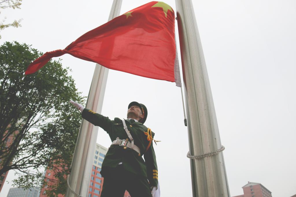 红旗飘扬,鼓乐齐鸣。守护国旗壮人心,步步铿锵踏将来。国旗护卫方阵目光如炬,精神昂扬。