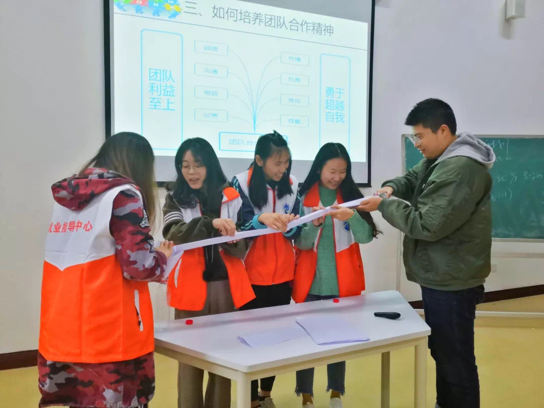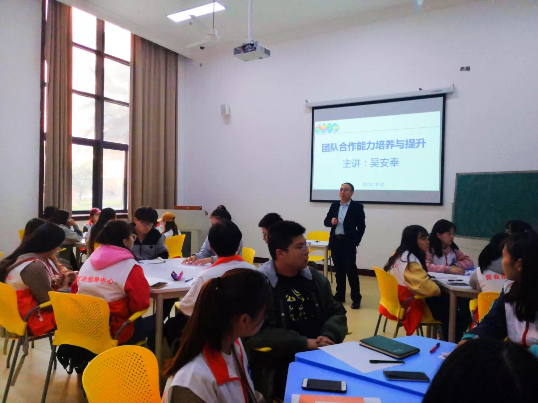 单丝不成线,独木难成林。2019年10月31日下午3点20分,在教学楼1118教室开展了“职引人生”工作坊的第二讲——“团队合作能力培养与提升”旳专题培训活动。我们有幸特邀到重庆百事得律师事务所运营总经理、重庆百事得大牛机器人有限公司执行董事、中国公共关系协会理事、重庆市高校就业创业指导专家 ——吴安奉老师作为本讲的培训讲师。