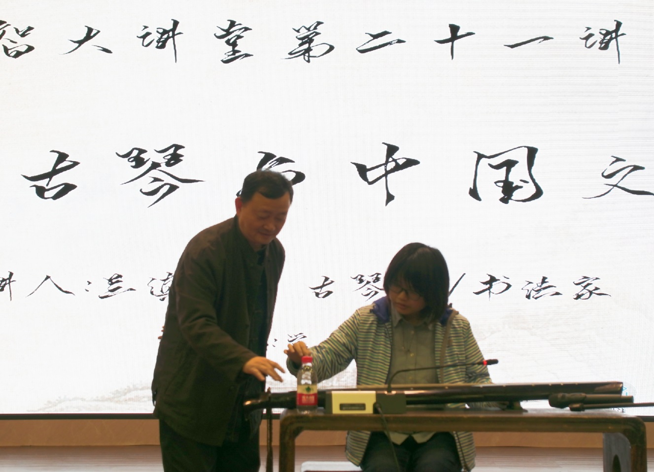 讲座最后,兰先生邀请了几位同学上台试琴。他亲自教授,同学们争相尝试,在弹奏过程中感受了古琴清、和、淡、雅的音乐品格。
