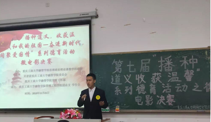 2019年11月21日,由思政部、校团委、党群工作部主办,管理工程学院承办的第七届“播种道义,收获温馨”系列德育活动之微电影决赛于教学楼1512教室成功举行。担任本次决赛评委有思政部常晓薇主任、周敏老师,校团委书记李刚书记,郑旺老师,学生会副主席陈宇涛同学。本次决赛共有10支队伍,分为微电影展示和现场主题讲解两个环节。
