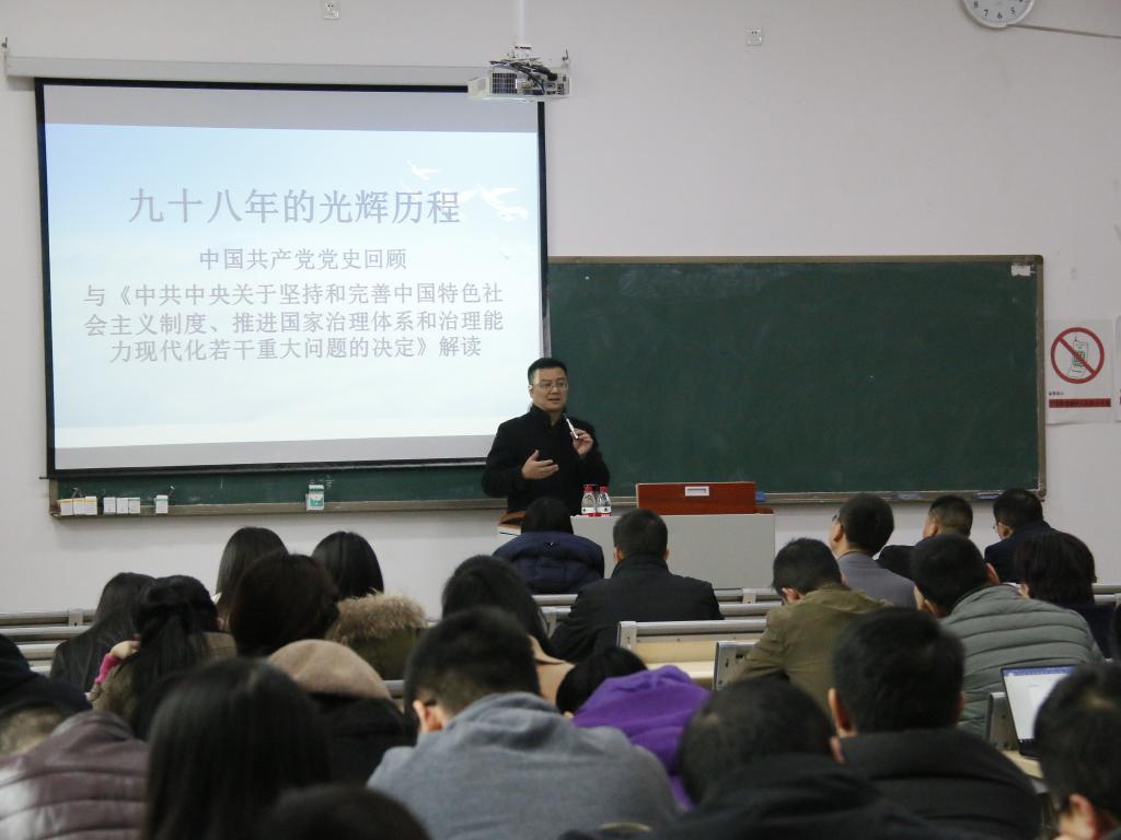 为扎实推进“不忘初心、牢记使命”主题教育,进一步激励和引导广大党员干部更加坚定自觉地践行党的初心和使命,根据学校《“不忘初心、牢记使命”主题教育工作方案》的要求,11月22日,我校“不忘初心、牢记使命”主题教育专题党课在1406教室顺利召开。校党委书记丁广龙以“九十八年的光辉历史——中国共产党党史解读”为主题,结合十九届四中全会精神,为全体教师党员讲授了主题教育专题党课。专题党课由党群工作部部长倪倩茜主持。