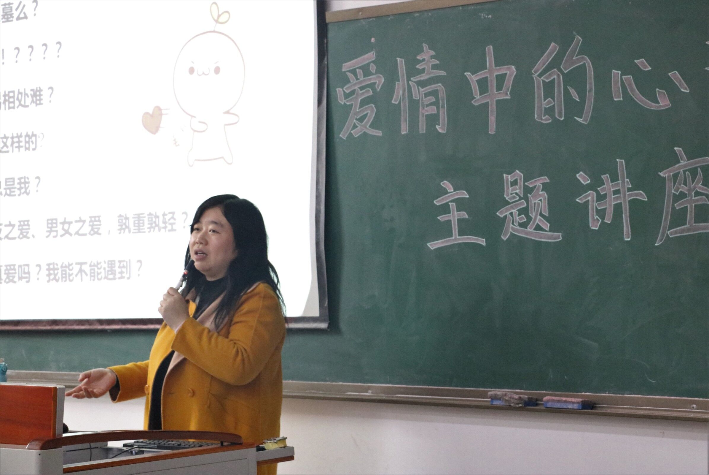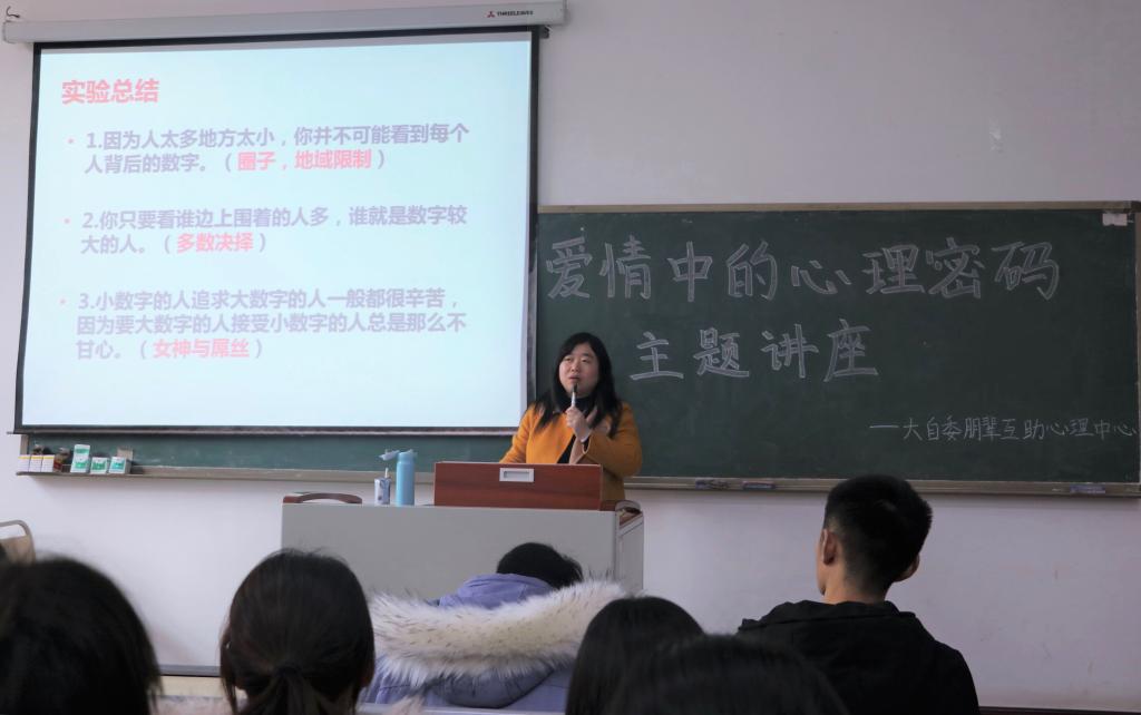 为了帮助同学们树立正确的爱情观,提升对爱情的理性认知,解决恋爱过程中的种种困惑,我校于2019年12月4日12点20分在教学楼1406教室开展了“爱情中的心理密码”主题讲座,本次讲座由西南政法大学学生处副处长胡晓担任主讲人。