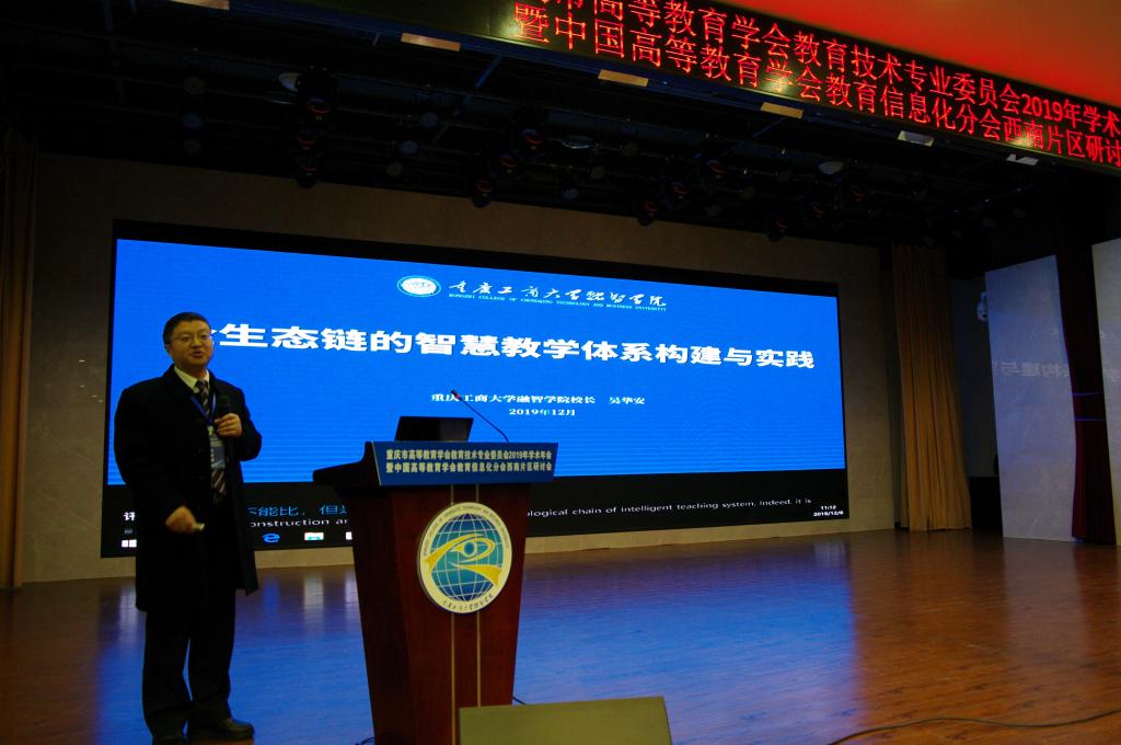 我校常务副校长吴华安教授作了“全生态链智慧教学体系的构建与实践”主题报告。吴校长向与会人员介绍了我校智慧教学建设历程、具体做法、取得的成效、经验及体会,以及学校将在教学改革和实践探索的道路上不断深耕细作,继续推行信息技术与混合式教改、在线课程建设、教学数据治理分析等多个层面及维度深度融合,为全面提升教学信息化,提高人才培养质量提供保障。