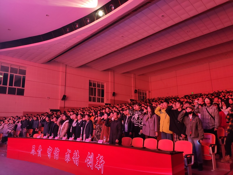 全体参会人员佩戴团徽,伴随着合唱《光荣啊!中国共青团》拉开序幕。通过主持人分享的形式让大家深入了解了“一二•九”运动发生的时代背景,带领大家重回那个激情澎湃的年代,再现了当时青年学子在党组织的领导下,组织和发起这场爱国学生运动的场景,号召青年学子担当起时代赋予的历史重担,为实现中华民族伟大复兴而努力奋斗。全体参会人员面对团旗重温入团誓词。