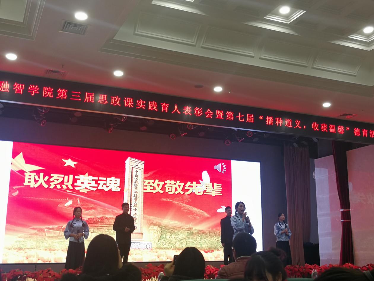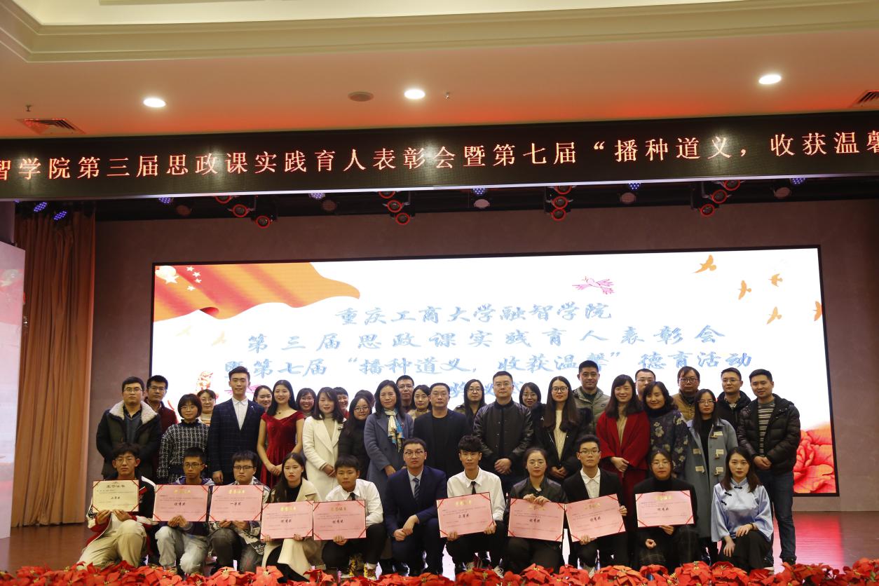在庆祝新中国成立七十周年之际,为了大力推动思政教育“三个课堂联动”实践育人模式,表彰在思政教育教学中的先进个人,展示思政德育活动系列成果,20191211日下午1800,由重庆工商大学融智学院思政部、党群工作部、团委联合主办、管理工程学院承办的第三届思政课实践育人总结表彰会暨第七届播种道义,收获温馨系列德育活动颁奖仪式在融智学院学术报告厅成功举行。