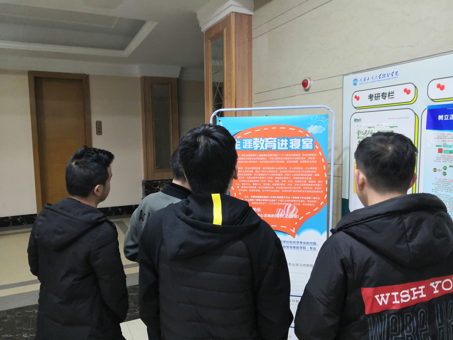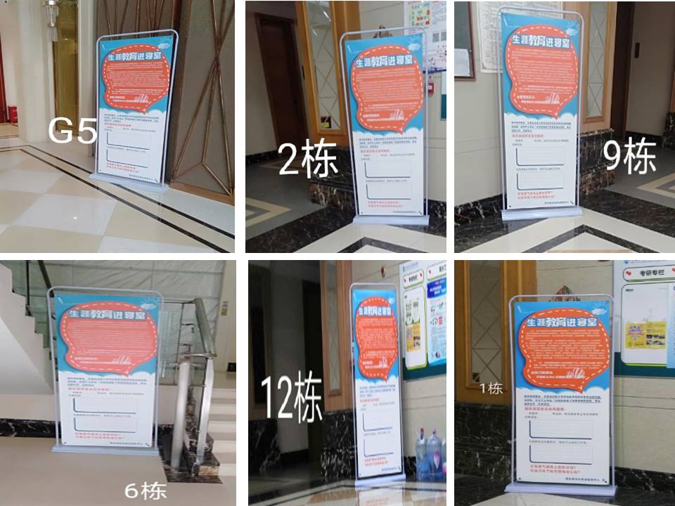 “生涯教育进寝室”活动于2019年12月16日正式启动,就业指导中心通过海报展架展览展示的形式向每栋学生公寓投放学生职业生涯发展、职业能力提升、职业行业发展等相关宣传物料,将生涯教育资源带到学生寝室,使学生能利用零碎时间了解到学生就业指导中心这个平台,帮助学生更好地探寻就业方向、规划职业道路。此项活动将长期、持续、分阶段、以不同主题开展,每两周围绕特定主题更新宣传内容。