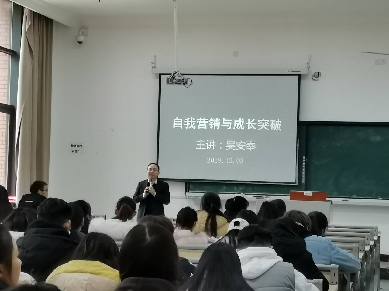“大学生自我营销与成长突破”讲座中,吴安奉老师从西游记中师徒四人的个人特点进行分析,引导同学们采用SWOT分析法对自己进行自我认知设计规划;通过对营销高手必备的五种素养的讲解,启迪同学们认识到“表达自己,与人沟通”能力的重要性;从心态管理、目标管理、时间管理、学习管理、知识管理教会同学们实现良好自我管理的方式方法,实现成长突破,为如花锦簇的未来铺好道路。