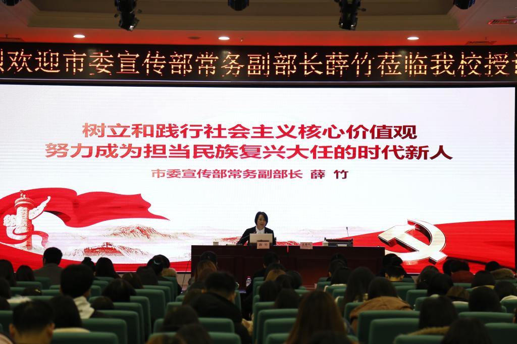 薛副部长围绕“作为新时代的青年学生应该怎样树立和践行社会主义核心价值观”,从十九届四中全会中对社会主义核心价值观提出的新要求为切入点,系统讲授了社会主义核心价值观的提出过程和主要内容、社会主义核心价值观的重要意义、习近平总书记关于社会主义核心价值观的重要论述以及如何深入践行社会主义核心价值观这四方面内容。薛副部长的讲解高屋建瓴、科学引领、催人奋进,为下一步我校深入践行社会主义核心价值观提供了明确的指引和清晰的行动指南。