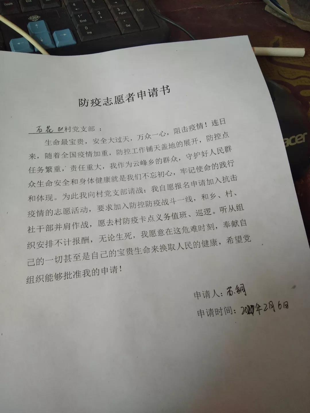 “作为一名预备党员,这是我应尽的责任和义务,为人民服务,愿武汉加油,中国加油!”