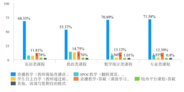 在学生希望采取的在线教学模式方面。从统计数据看,不管是哪一类课程,学生对“在线直播”这种方式比较认可,占比均在50%-71%之间,是学生期待的授课方式。而对校内平台课堂+答疑、学生自主学习等方式选择较低。相比录播课程,在线直播课程在交流互动上更有一定的优势,能够较好满足学生需求。