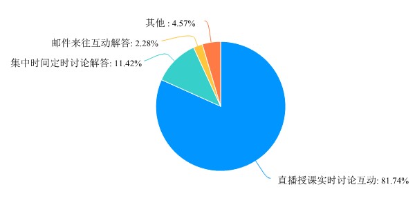 互动方式方面,81.74%的教师在直播授课时与学生实时互动,11.42%的教师通过集中时间段组织学生进行互动讨论和解答,还有不到10%的教师通过邮件或其他方式与学生进行互动。