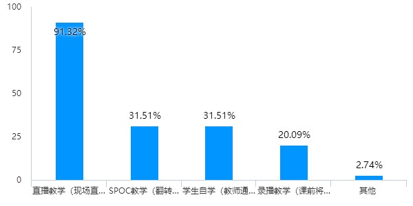 教师开展线上教学91.32%以上用到了直播教学,接下来依次是SPOC教学、学生自学和录播教学,都是学生预先学习课程(MOOC资源、教师发送资料、录播课程讲解)为主、教师组织讨论答疑为辅。说明在有条件的情况下,教师更喜欢同学生实时讲解和互动。