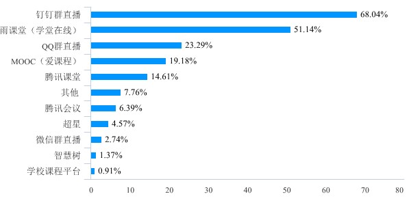 在用到网络教学平台问题上,学生喜欢的网络平台从多到少依次是钉钉群直播、雨课堂(学堂在线)、腾讯会议、中国大学MOOC、腾讯课堂、学校课程平台及其他平台如U校园、博思智慧教学平台、B站等。