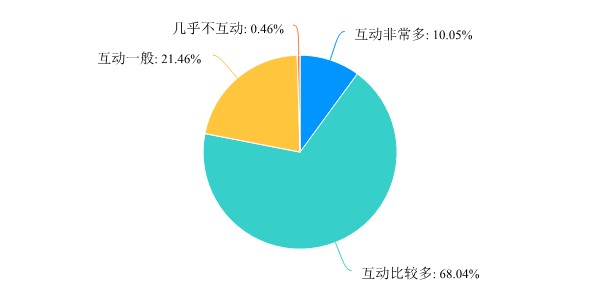 调查显示,68.04%的教师认为自己在线上教学中和学生互动比较多,更有10.05%的教师认为互动非常多,21.46%的教师认为互动不多。