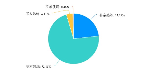 超过95%的教师能熟练使用教学平台进行线上教学,接近1/4的教师非常熟练,还有不到5%的教师不能熟练运用教学平台的功能。