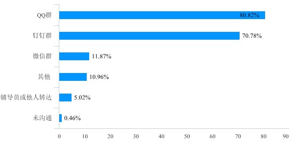 与学生的沟通联系上,QQ群和钉钉群用到的最多,分别有80.82%成和70.78%成左右的老师用到了这两种方式,11.87%的老师通过微信群来和学生联系,还有10.96%成的老师跟学生联系用到了其他方式。