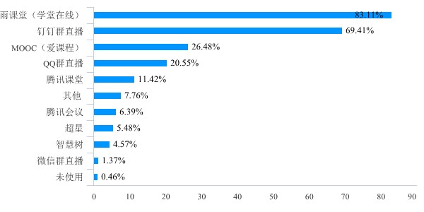 在线上教学过程中,教学平台运用最多的是雨课堂和钉钉群,分别有83.11%和69.41%的老师作为主要线上教学平台,远超过其他平台的运用,其他运用较多(10%以上)的平台还有MOOC、QQ群、腾讯课堂等。