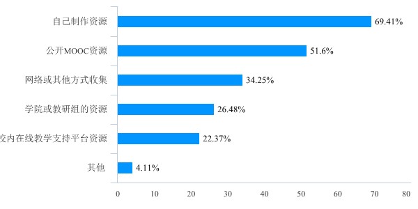 教师用来线上教学的教学资源获取来源方面,69.41%的教师自己制作教学资源,接下来的来源从多到少依次为MOOC、网络搜集、学院提供、校内在线教学平台。